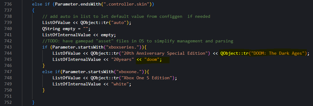 Donc si on veut gérer un nouveau, il faudra mettre à jour le ListModel qui se trouve dans GamepadEditor.qml dans un premier temps en rajoutant un ListElement un nom et le chemin du fichier comme ci-après (exemple pour la SNES):
