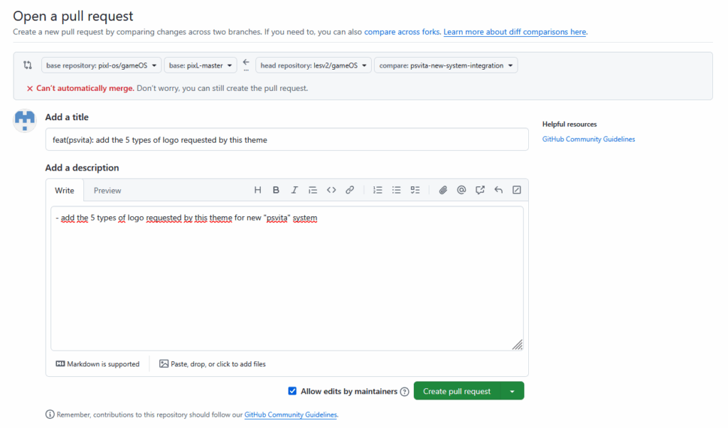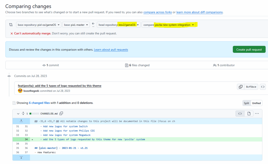 Après avoir cliqué sur « Create pull request » merci de nous contacter sur discord pour nous prévenir et que les code owners/mainteners puissent revoir votre contribution, en discuter et pour l’inclure vos travaux dans pixL 😉